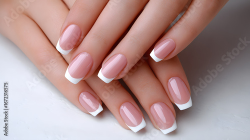 Classic French manicure with natural pink base and white tips, elegant nail art for timeless style.