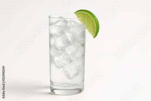 Classic gin and tonic cocktail in a highball glass with ice cubes and a fresh lime wedge garnish isolated on a clean white background