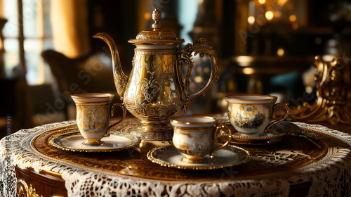 Classic Golden Teapot Set with Porcelain Cups on Ornate Table with Lace in Elegant Vintage Setting