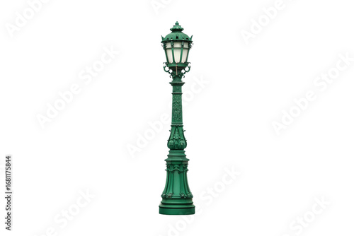 Classic green ornamental street lamp with intricate base and crown, frosted glass lantern, isolated on a transparent background
