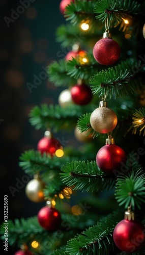 Classic green tree, colorful baubles, bright blurry lights, xmas, element, winter