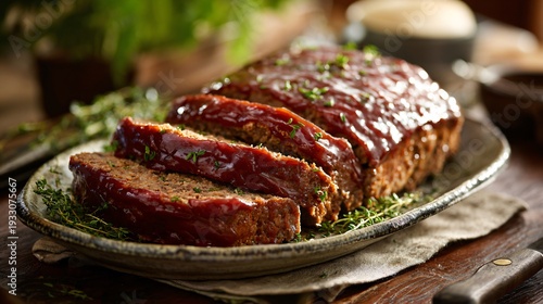 Classic homemade meatloaf sliced thickly, glossy ketchup glaze on top, served on a rustic ceramic platter, dark wooden farmhouse table, warm natural window light, cozy comfort-food atmosphere