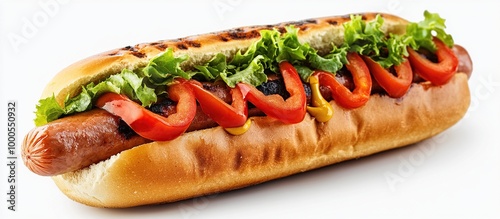 hot, dog, food, fast, sausage, bun, lettuce, tomatoes, mustard, ketchup, grilled, delicious, tasty, snack, meal, street, american, cookery, dinner, lunch, breakfast, white, background, isolated, close, up, fresh, yellow, red, green, brown, meat, bread, vegetable