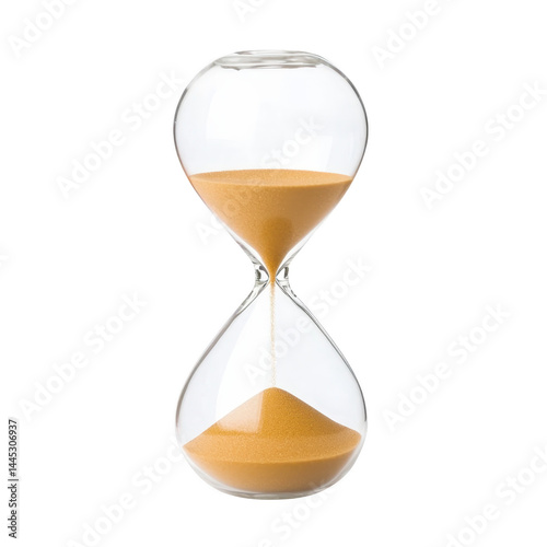 Classic hourglass with golden sand flowing through glass timer symbolizes passage of time and patience. sand trickles steadily, marking each moment with precision