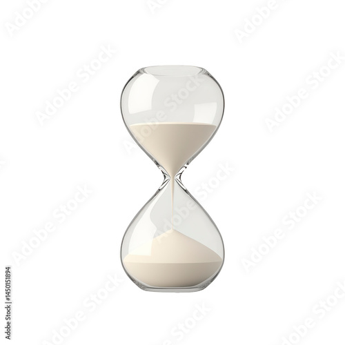 Classic hourglass with white sand elegantly flows from top chamber to bottom, symbolizing passage of time. transparent glass design adds timeless and minimalist aesthetic