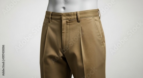 Classic khaki pleated trousers on mannequin: business casual attire with tailored fit and smooth fabric texture