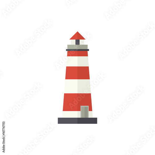 Classic lighthouse, nautical structure, flat cartoon vector illustration isolated on white background. Flat cartoon illustration of marine lighthouse, red and white