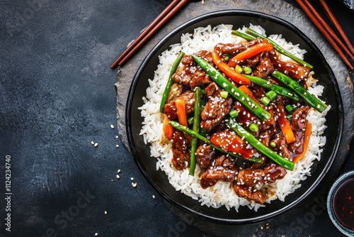 Classic Mongolian beef stir fry on an iron plate with rice and soy sauce on a gray surface Overhead view empty space