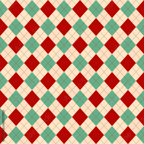 Classic red and green argyle seamless pattern with cream background, perfect for Christmas designs, textiles, and retro holiday projects