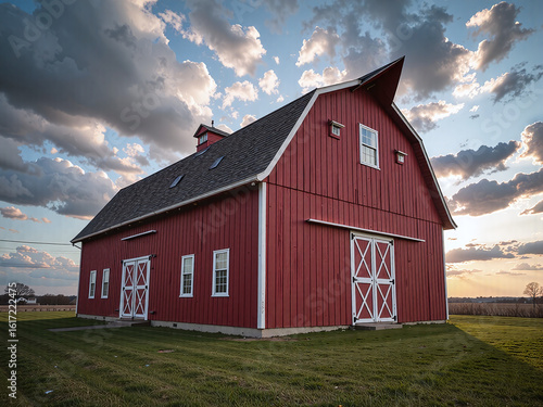 Classic red barn architecture under a dramatic sky, captured with depth and rural pride.