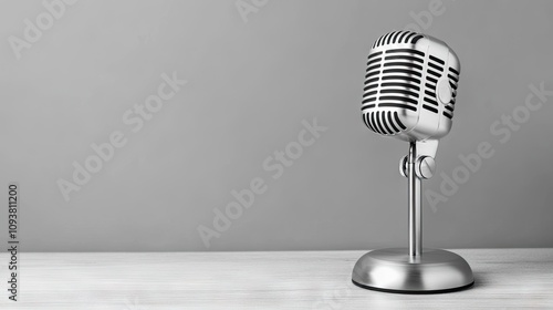 Classic Retro Microphone on a Minimalist Table Against a Soft Grey Background, Perfect for Music, Podcast, or Vintage Audio Concepts in Professional Settings
