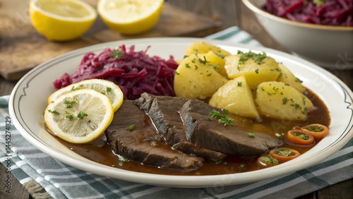 Classic Sauerbraten with Potatoes and Red Cabbage