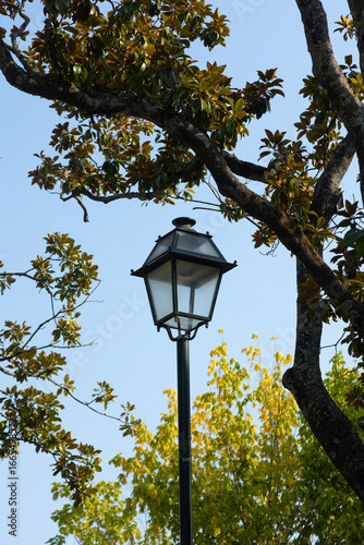 Classic street lamp surrounded by tree branches with green leaves, urban detail in Lisbon