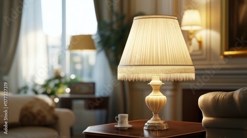 Classic table lamp with delicate carvings, providing a warm ambiance in a vintage living room's cozy corner