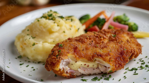 Classic ukrainian chicken kiev with creamy mashed potatoes and fresh garden vegetables served on a rustic wooden table