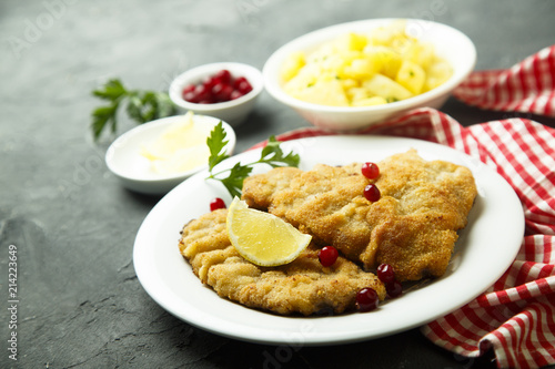 schnitzel, potato, chicken, salad, breaded, wiener, food, steak, cutlet, fried, veal, lemon, plate, escalope, german, meal, meat, delicious, dinner, roasted, fillet, dish, background, white, pork meat, viennese, lunch, cooked, portion, chop, cranberry, fresh, closeup, epicure, homemade, organic, sirloin, vienna, style, potato, tasty, eat, cookery, bread, juice, rustic, lettuce, parsley, bio, austrian