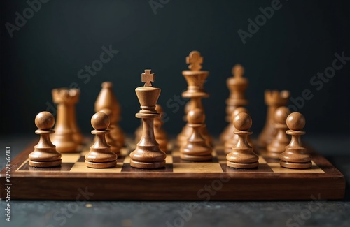 Classic wooden chess set on dark background. Chessboard with pieces for strategy game, intellectual challenge. Photo celebrates International World Chess Day, embodies competition, business tactics,
