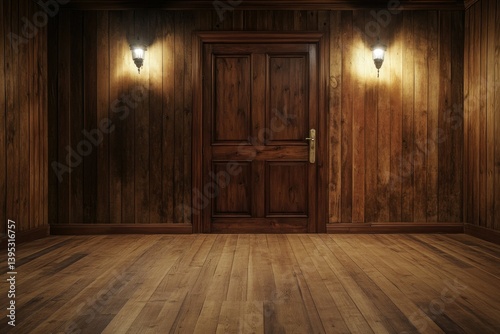 Classic Wooden Room Interior with Door and Wall Lamps Warmly Lit