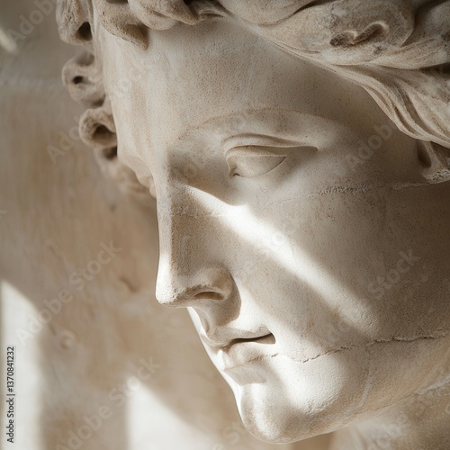 marble, statue, classical, sculpture, face, closeup, detail, texture, shadow, serene, expression, art, craftsmanship, antiquity, greek, roman, historical, artistic, stone, carving, relief, portrait, human, figure, mythology, timeless, elegant, refined, delicate, smooth, contrast, light, monochrome, museum, gallery, heritage, culture, masterpiece, beauty, anatomy, sculptor, white, grey