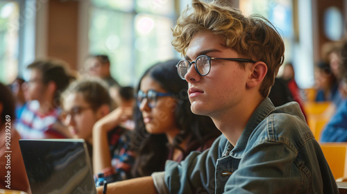student, classroom, lecture, sharpened, education, learning, goggles, laptop, blond, diverse, cognition, attention, university, college, young, listening, academic, study, serious, group, indoor, daylight, engaged, interaction, modern, discussion, educational, audience, participant, intellectual, concentration, lecture hall, casual attire, community, inquiring, knowledgeable