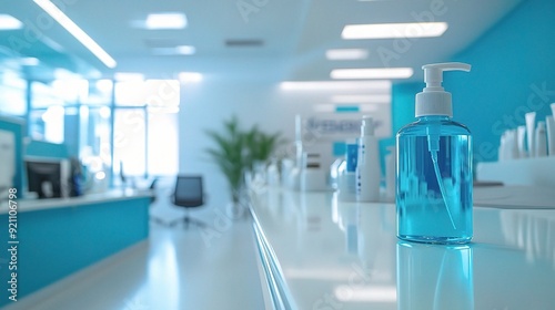 Clean and Safe: A close-up of a blue hand sanitizer bottle on a white countertop in a modern office setting.