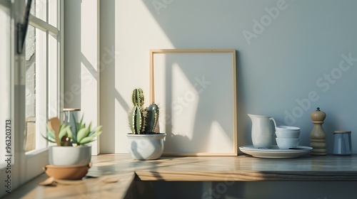 Clean and stylish kitchen nook with a small cactus placed on the windowsill next to an empty wooden frame and a breakfast table set with minimalist tableware