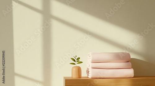 Clean design minimalist concept. A serene arrangement of soft towels and a small plant against a sunlit wall.
