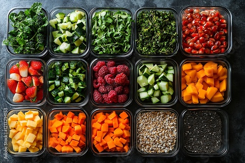 Clean eating spread with fruits, vegetables, seeds, and superfoods arranged on a concrete table for meal prep inspiration