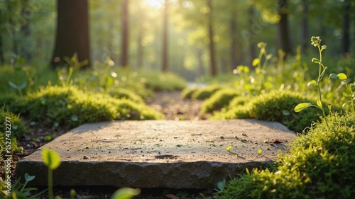 nature, forest, wood, stone, moss, green, sunlight, sunbeam, light, natural, background, platform, display, product, earthy, organic, serene, tranquil, peaceful, environment, forest floor, texture, natural beauty, timberland, scenic, natural light, clean, fresh, growth, untouched, wild, rustic