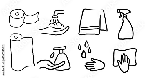 cleaning, hand, hand-drawn, linear, set, hygiene, instruction, vignetting, spray, soap, towel, paper, cream, rag, water, sanitize, sanitary, antiseptic, bottle, washing, disinfect, home, bathroom, privies, domestic life, service, doodle, laundry, chore, equipment, advertisement, domestic, object, contour, housework, routine, industry, illustration, icon, graphic, simple, isolated, product, element, tool, gel, kitchen, dirty, design