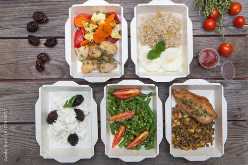 Clean healthy oil-free low fat ready to eat food in takeaway meal box sets on wood background top view with copy space