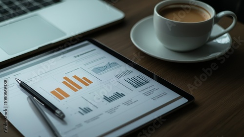 clean, minimalist workspace with an open tablet displaying financial projections, a pen, and a cup of coffeet