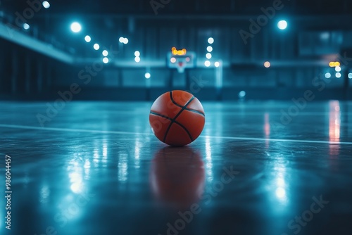 Clean Orange Basketball on Court in Arena at Night, AI generated illustration
