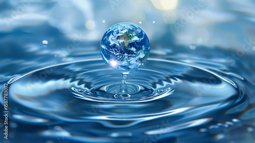 Clean water droplet rising from ripple in calm blue surface symbolizing purity and fluid motion
