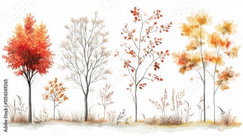 Clean white background with serene autumn tree and plant illustrations, capturing the calm and tranquility of the season