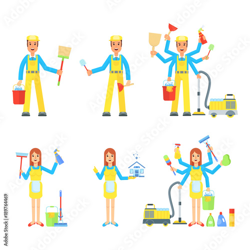 Cleaning service. Man and woman in uniform, clean tools. Vacuum cleaner and ladder, mop and bucket. Flat vector cartoon illustration. Objects isolated on white background.