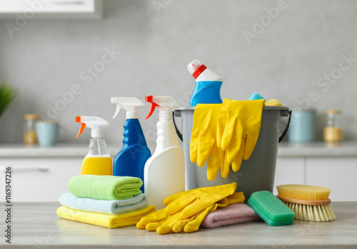 Cleaning supplies arranged on a kitchen counter showing various products and tools for home maintenance and hygiene
