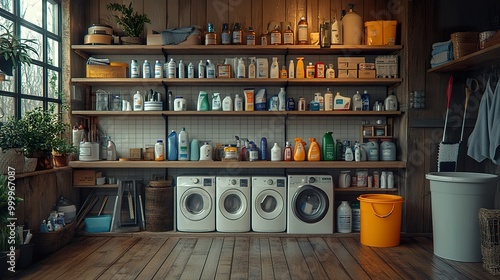 cleaning, supply, utility, room, organisation, detergent, clothes, brush, mop, bucket, shelf, storage, housework, home, household, maintenance, hygiene, cleanliness, order, tidiness, efficiency, practical, functional, domestic, chore, tool, equipment, essential, neat, organised, tidy, spotless, sanitary, fresh, clean, white, blue, yellow, red, green, grey, orange