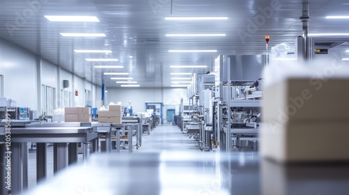 factory, manufacturing, industry, production, technology, automation, machinery, equipment, conveyer, assembly, line, stainless, steel, metal, box, cardboard box, product, workspace, industrial, processing, plant, warehouse, modern, sterile, innovation, efficiency, system, process, clean, bright, light, interior, design, hallway, building, architecture, corporate, business, operation, work