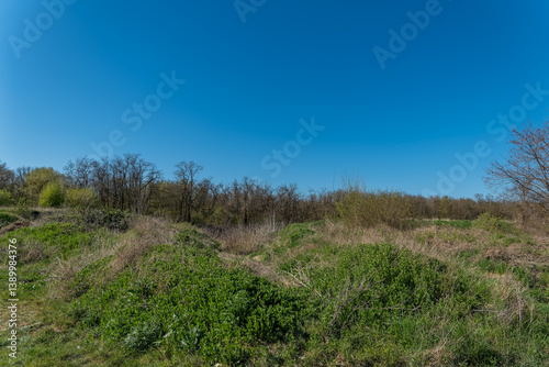Clear blue sky above lush greenery and wild grass in a serene landscape during a sunny day in spring