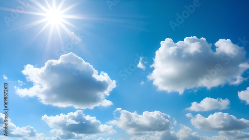 Clear blue sky background with fluffy white clouds and bright sunlight