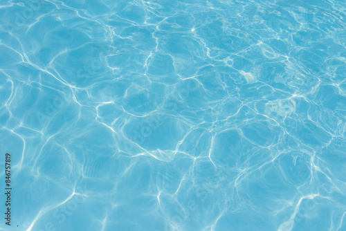 Clear blue swimming pool water surface with sunlight reflections creating abstract patterns and ripples, evoking a refreshing and tranquil summer vibe.