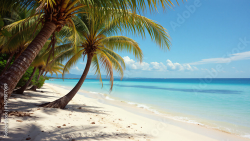 clear, calm, ocean, water, reflect, vibrant, blue, sky, meeting, beach, fine, light, beige, sand, mature, palm, tree, their, trunk, textured, age, catered, tropical, image, warm, sun, drenched, experiencing, evocative, vintage, travel, photo, film, artifact, summing, tactile, quality, diffused, highlight, subtile, element
