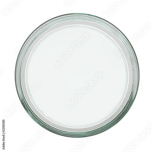 Clear Empty Transparent Glass Petri Dish. 3D Render Isolated on White Background.
