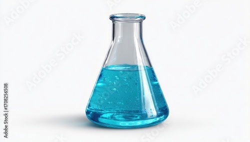 Clear glass conical flask, filled with light teal liquid, isolated on white background
