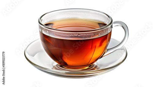 Clear Glass Cup and Saucer with Black Tea. Transparent Background, PNG.