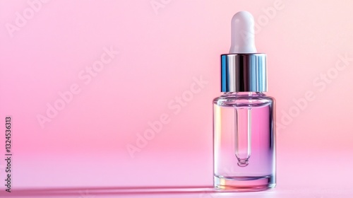 clear glass dropper bottle filled with a light serum stands prominently against a soft pink background, highlighting the elegance of beauty products and skincare essentials for daily use