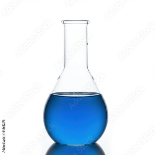 Clear glass flask filled with vibrant blue liquid against a stark white background in laboratory setting
