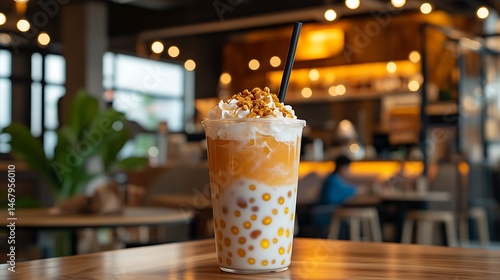 Clear Glass of Milk Tea with Tapioca Pearls, Wide Straw, Modern Cafe Vibe