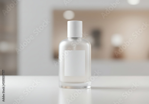Clear glass perfume bottle mockup on white table for branding and product presentation and design template